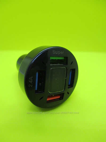 Зарядний пристрій для телефона в автомобіль.Пристрій має 4 вихода USB. Є також вольтметр.