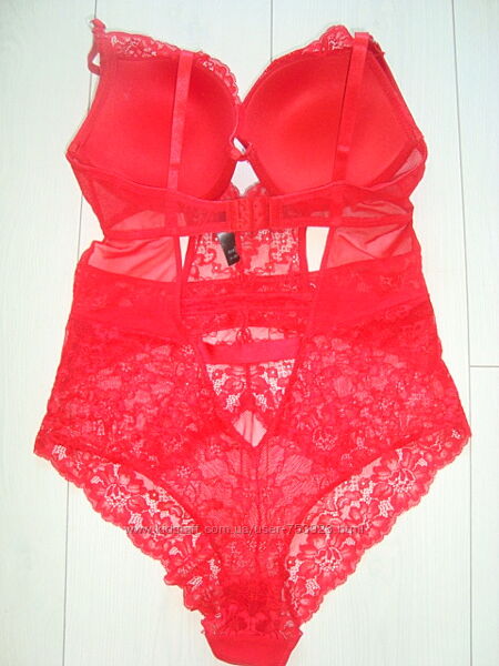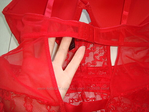 У продажу фантастичний боді від бренду Secret Possessions, розмір по бирці вказаний 80С. Боді червоного кольору, чашка великої щільності пушап. Боді виконано з квіткового мережива, дрібної сітки, сатинових
