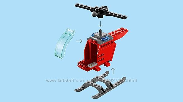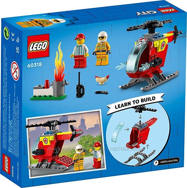 Что в коробке? — все необходимое для сборки игрушечного пожарного вертолета, а также минифигурки пожарного и продавца, мусорный бак с пламенем LEGO® и забавные аксессуары, включая подгоревший хот-дог.