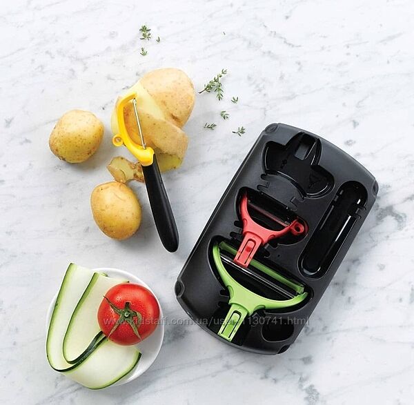 Набор Клик сэт - это умное решение в компактном хранении. Одна ручка для трех насадок – овощечисток, с помощью которых можно аккуратно почистить овощи и фрукты, а также нарезать кабачки или баклажаны ровными пластинами.В состав набора входят три специальных лезвия: