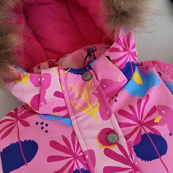 Капюшон спереду фіксується потайними липучками, декорований натуральним хутром. Капюшон та хутро відстібаються. У рукавах куртки вшиті мякі манжети.