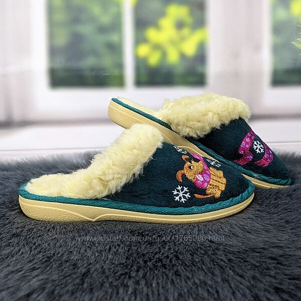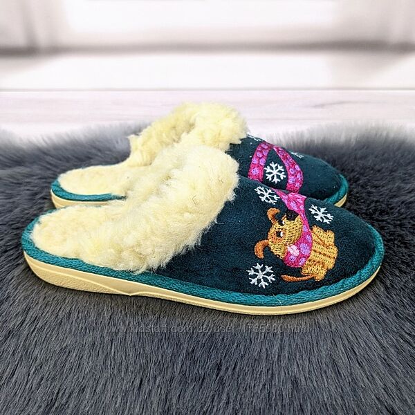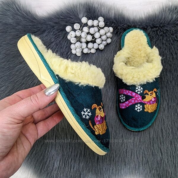 Подробное описание: Тапочки детские Белста зеленые с овчиной и вышивкой 5120