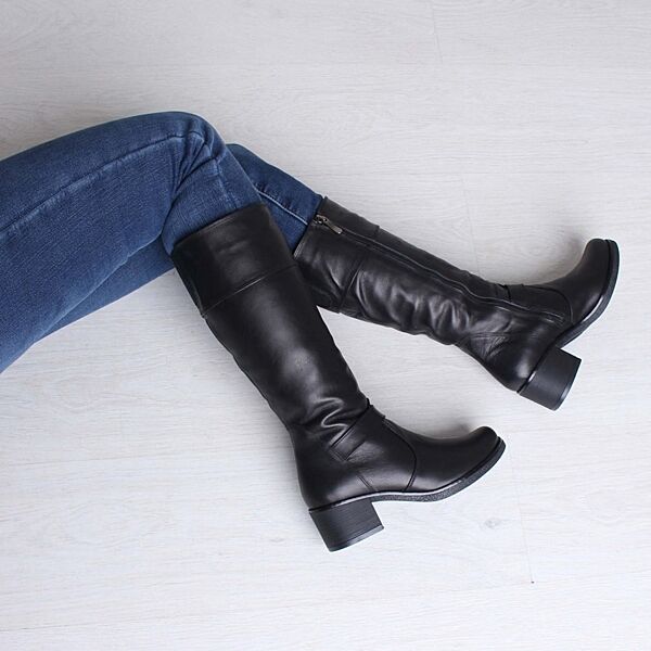 Модные повседневные кожаные зимние сапоги в отличном качестве. Элегантный дизайн с невысоким каблуком 5 см , классический черный цвет, в верхней части эластична тканевая вставка для регулирования обхвата голенища,