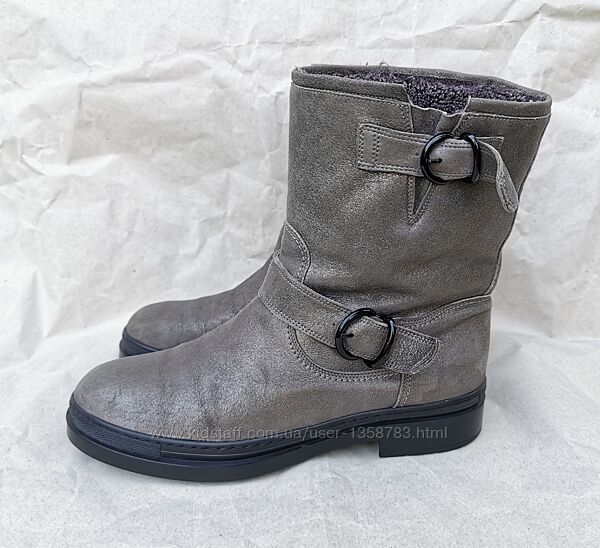 В отличном состоянии, немного потертости на замше присутствуют.Цвет серый, покрытый немного серебром, поэтому и блестит.