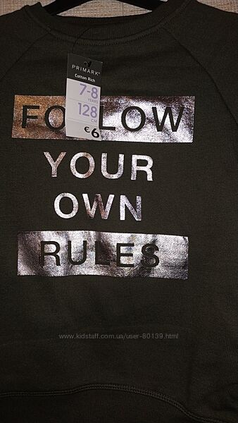 Primark (Испания) теплый реглан, свитшот. Основной цвет хакки, красивый серебристый принт СЛЕДУЙ СВОИМ ПРАВИЛАМ, подойдет как мальчикам так и девочкам. Очень красиво смотрится.На рост 128 7/8 лет