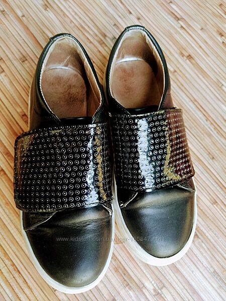 Шкіряні снікерси від українського виробника Beloli. Дуже якісна м´яка шкіра зовні і всередині, стильна підошва, зручна застібка - широка липучка, міцно тримає. Підошва була з такими потертостями спочатку, то не бруд))) Можна носити до пізньої осені.Стан чудовий. Розмір 34, устілка 21.5см.
