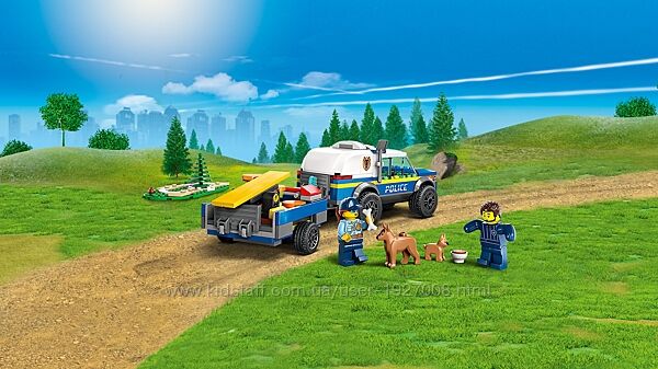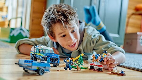 Гав! Гав! Присоединяйтесь к подразделению полиции K9 LEGO® City для дрессировки собак и обучения щенков. Загрузите оборудование в прицеп. Не забудьте чаши для кормления! Помогите взволнованной полицейской собаке и щенку сесть в крутой внедорожник K9, и отправляйтесь на площадку для дрессировки. Прибыв на место, установите качели, планку для прыжков и тренировочные грибочки и приготовьтесь к веселому дню.