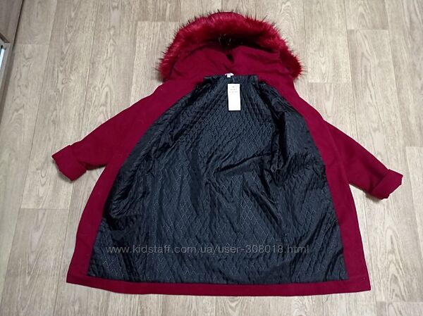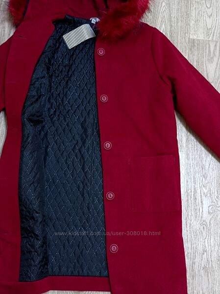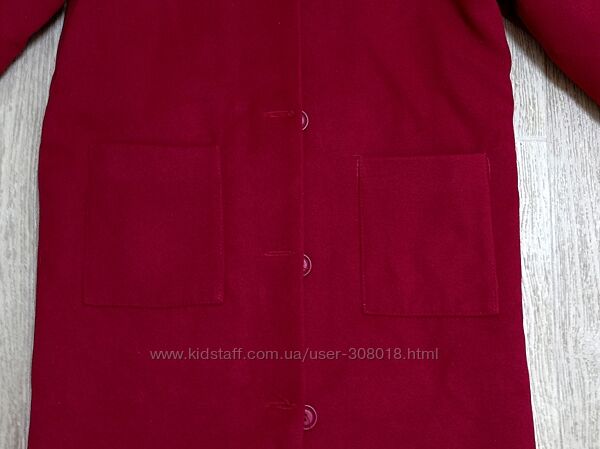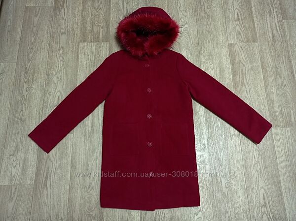 Демисезонное кашемировое пальто вишневого цвета на рост 146 см, но за счёт манжета (подворота) рукава можно будет носить намного дольше. Утеплено тонким синтепоном. По переду два накладных кармана. Капюшон не съёмный.Ширина между подмышками 46 см, длина по середине спинки 79 см, плечо 9,5 см, рукав от плеча 61 см( можно подвернуть манжет на 7 см.
