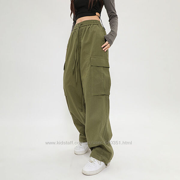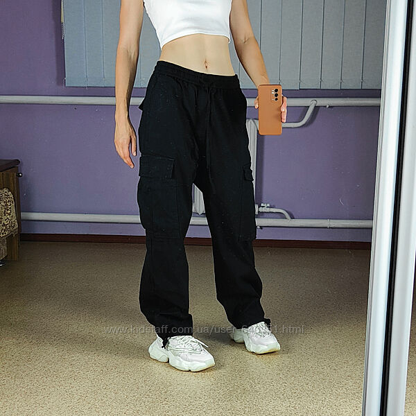 Женские штаны карго с большими карманами. Пояс на резинке со шнурком. Материал - хлопок, приятный к телу, хорошо дышит впитывает пот. Таблица размеров на фото.На модели размер S. Рост модели 165 см, вес 45 кг.