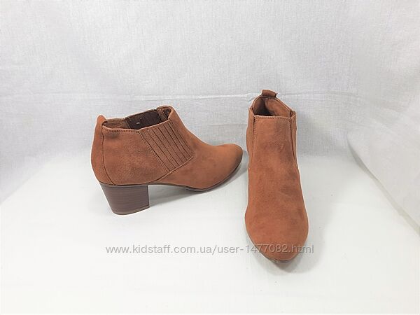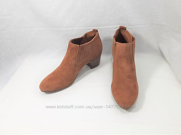 Нові, сток, не носилися.Верх натуральна замша, красивого рудувато-коричневого кольору, всередині натуральна шкіра + текстиль, зручний підбор, лаконічний дизайн. Красиві та комфортні. На підошві є сліди примірок і маленька цятка на підборі.