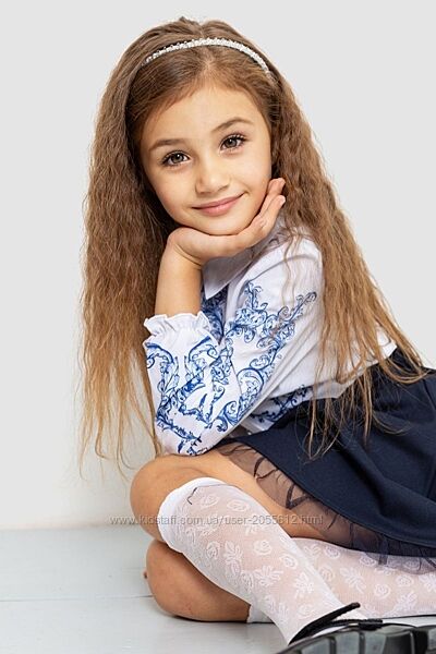 Блуза білого кольору з синім принтом виготовлена з віскози.Має прямий крій, довгий рукав. Застібається ззаду на гудзик. Тканина не тягнеться.