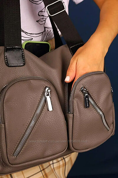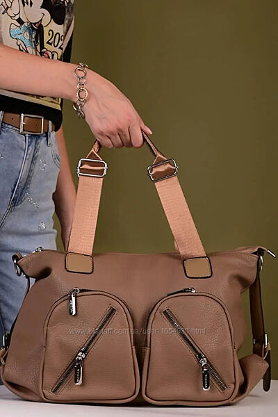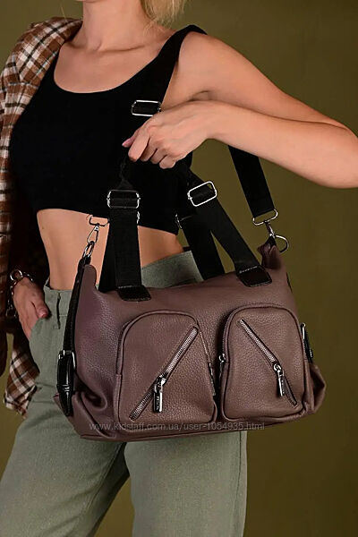 Сумка виготовлена зі штучної шкіри, застібається на блискавку Має два відділи, один великий і один маленький, перегородку на блискавці та 3 кишені, одна з яких на блискавці На фасаді 4 кишені на блискавці та ззаду сумки кишеня на блискавці У комплекті є регульований ремінь 120 см Довжина ручок 49 см Розмір 41*28*12,5 см.