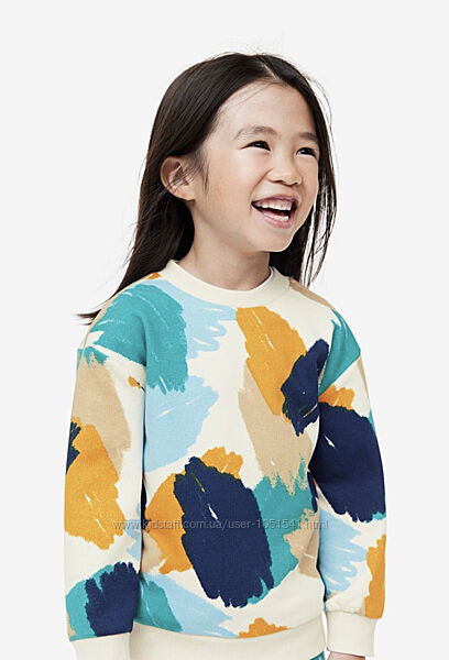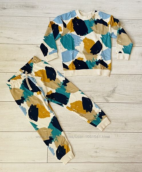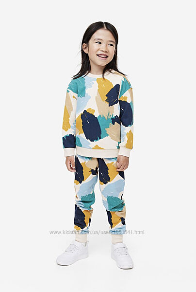 Зручний комплект H&M з легкої тканини( двунить ) що складається зі светра та штанів. Светр має круглу горловину з ребристою облямівкою, опущені плечові шви .Штани мають пояс на резинці та зав’язках, а також рубчик внизу штанин.СКЛАД 80 %-бавовна , 20 % - поліестер .