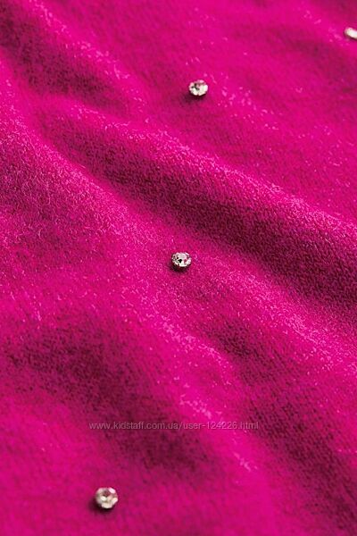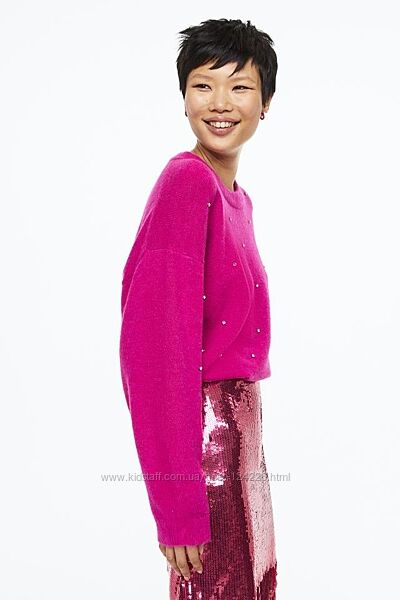 Джемпер з м´якого трикотажу з вовняним переплетенням і пластиковими намистинами, пришитими спереду. Модель із круглим вирізом горловини, спущеними плечима та ребристою обробкою по горловині, манжетах і подолі.