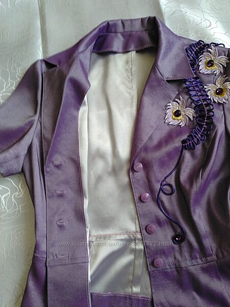 Пропоную оригінальний літній костюм в комплекті блуза та спідниця. Розмір хs, Світло-фіолетового кольору. Тканина тафта. Костюм шився на замовлення, існує в одному екзеплярі.Спідниця пряма, довжина - міні, ззаду застібка на блискавці, довжина спідниці - 41,5 см, ширина в таліі - 33 см, ширина в стегнах - 43 см.