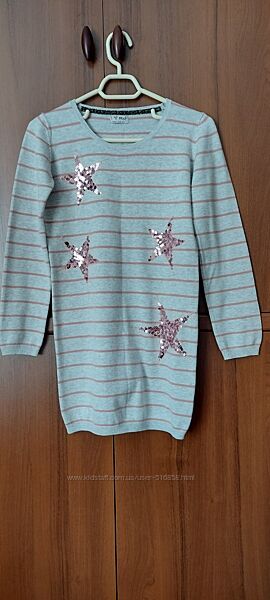 Next плаття р.140, 9-10років. Куплено на офіційному сайті. Подовжене плаття, як туніка. Склад 100% котон. Дуже приємне на дотик. Сіре в рожеву полоску, прикрашене зірками з паєток. Дуже стильне. Стан нової речі, видно по фото. Провисіло в шафі. Виїхали на початку війни, зараз повернулися - вже мало. Бірки зняли.Заміри:
