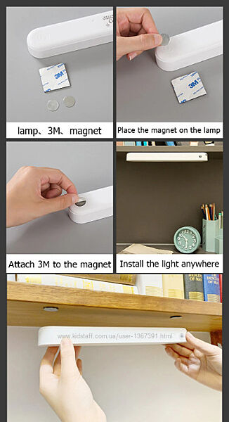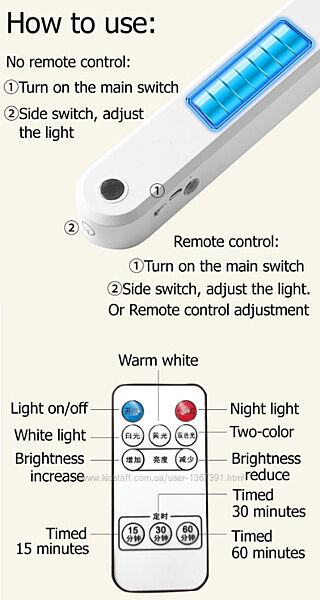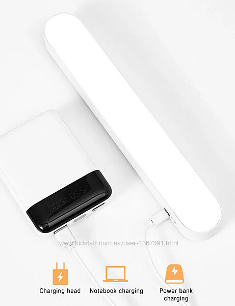 Сенсорне керування. Три режими регулювання яскравості (біле, тепле, природне світло) + поступове збільшення/зменшення яскравості утримуванням сенсорної кнопки. Також регулюється з пульта дистанційного керування, яким можна керувати на відстані близько 3 метрів. Колірна температура: 3000-6000K. Кріплення магніт, легко змінюється кут, а також знімається та використовується як ліхтар. Заряджається від мережі (кабель у комплекті), та від приладів з USB: павербанк, ноутбук, пк, тощо.Є інші світильники та лампи. Від двох штук - знижки.