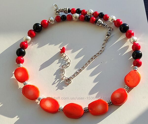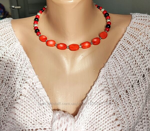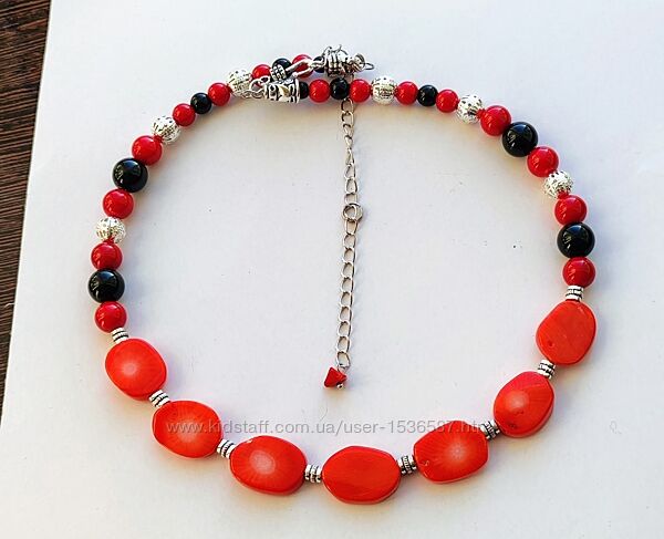 Кольє ′Коралове′ зібране з натурального червоного коралу на меморі-дроті. Застібка надійна. Також використані намистини чорного агату і металева фурнітура під колір срібла.Довжина - 44 см плюс 12 см подовжувальний ланцюжок.