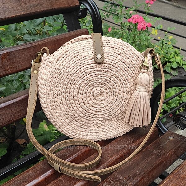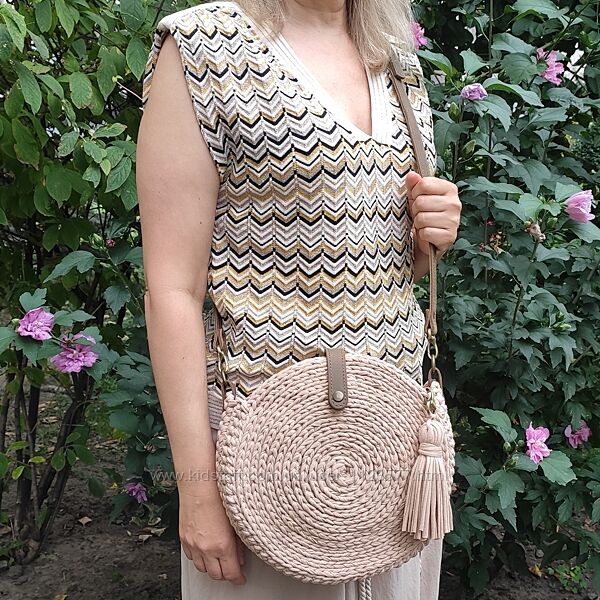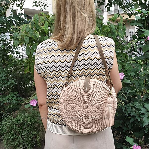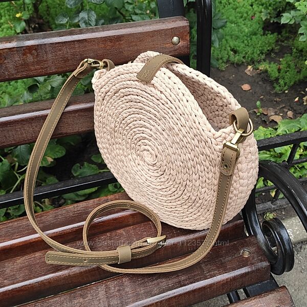 В наявності кругла сумка ручної роботи з трикотажної пряжі зі шкіряною фурнітурою. Має бавовняну підкладку та застібку блискавку.Модель настільки вдала і продумана, що стала бестселером серед моїх авторських сумок, що продаються.