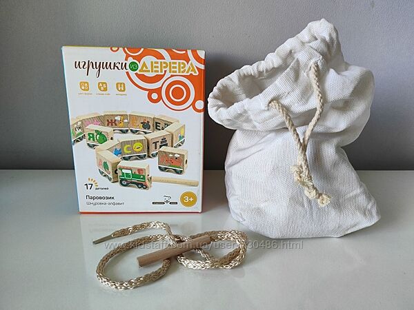 Шнурівка Паровозик - Алфавіт.У комплекті: 17 деталей, мотузка з голкою, текстильний мішечок.
