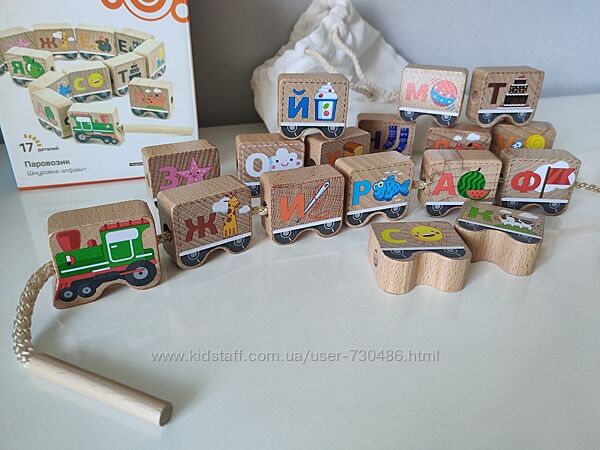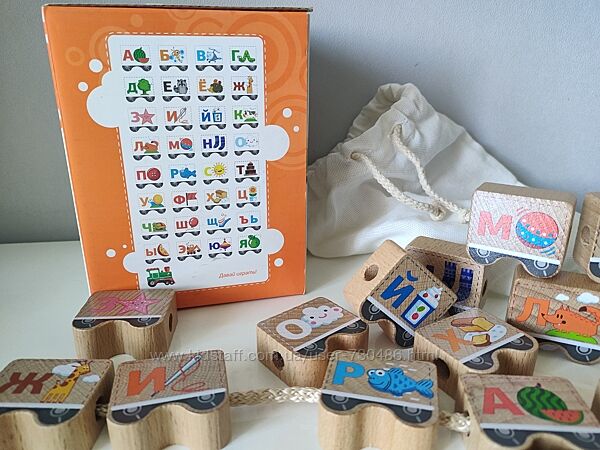 Подробное описание: Дерев´яна шнурівка паровозик з літерами, алфавіт Д001.