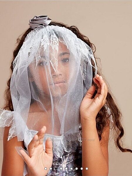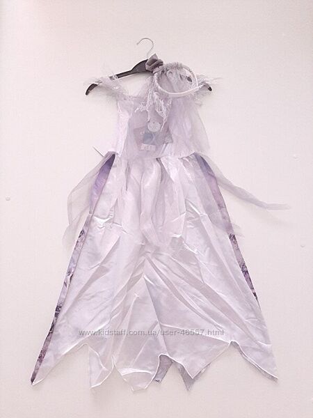 Карнавальный костюм для девочки на хэллоуин. Платье призрак невесты,зомби, ведьмочка, скелетна. В комплекте платье и обруч с ажуром и розочками.Верх велюр, на бретельках с крылышками, на поясе розочка, сзади на резинке, юбка длинная с фатином и ажуром. Цвет серый с белым. Замеры: