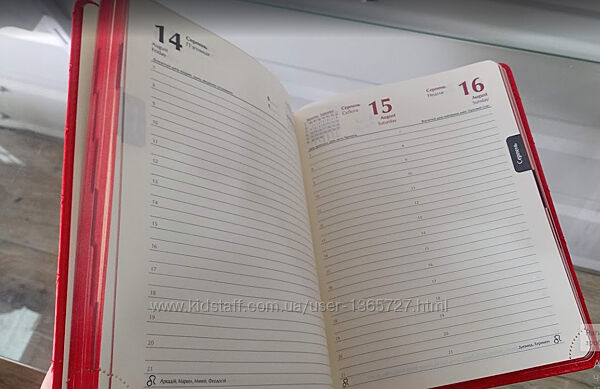 Датована сторінка на кожен день року з організатором часу від 7:00 до 21:00, календарем на поточний/наступний місяць, позначенням дня тижня, знаку зодіаку, іменинників