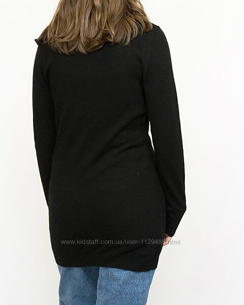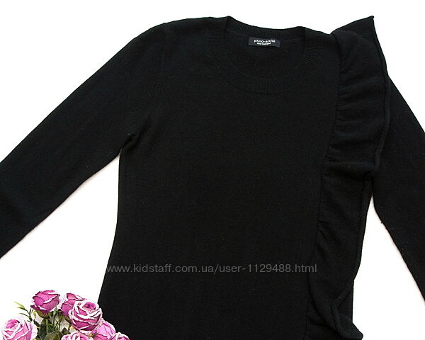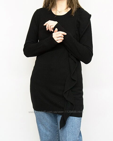 Вещичка породистая, оригинальная, выполнена из мягчайшего нежнейшего кашемира гладкой плотной вязки, насыщенного глубокого черного цвета. Декорирован эффектным вертикальным воланом, визуально вытягивает силуэт.