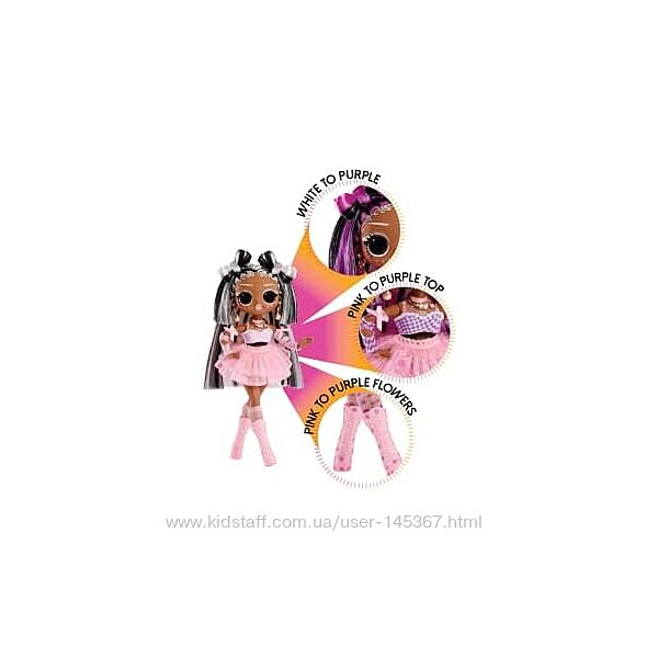 LOL Surprise OMG Sunshine Color Change Switches Fashion Doll Представляем модную куклу LOL Surprise OMG Sunshine Color Change!Когда дело доходит до пастельно-розового, Свитч знает, как представить свой любимый цвет самым неожиданным образом. Она любит переключать свою моду между своим опрятным и смелым образом и любит все стильные детали. Распакуйте множество сюрпризов с переключателями, включая одежду, меняющую цвет, и стильные аксессуары. Выносите Switch на улицу в любое время дня, будь то солнечно или облачно, или даже в помещении рядом с окном, чтобы создать гламурный образ. Наблюдайте, как волшебство происходит у вас на глазах, и смотрите, как цвет ее волос на одной стороне меняется с белого на фиолетовый. Можете ли вы угадать, на что изменится цвет другой стороны ее белых волос? Не забудьте проверить сюрпризы смены цвета на ее свирепой моде, которые постепенно раскрываются на улице. При воздействии света, Соответствующий клетчатый топ и рукава Свитча резко меняют цвет с розового на фиолетовый, а ее модная юбка, высокие носки и сапоги украшены фиолетовыми цветочными принтами, которые оживают. Вы можете повторять изменения цвета столько раз, сколько захотите! Вернитесь в помещение, чтобы вернуть Switchs к ее первоначальному виду, и вернитесь на улицу или к окну, чтобы снова испытать ее великолепные преобразования. У этой куклы Sunshine Color Change потрясающие черты лица, красивые волосы и множество поз. Профессиональный совет: руки снимаются для удобства одевания. Соберите всех 3 модных кукол LOL Surprise OMG Sunshine Makeover™: Bubblegum DJ, Sunrise и Switches. Модные куклы LOL Surprise со стильными прическами, нарядами и множеством детализированных аксессуаров делают идеальную игрушку для детей от 4 лет и старше для творческих игр! В качестве подарков к любому особому случаю куклы обеспечивают часы социальной игры с братьями, сестрами и друзьями! От MGA Entertainment, создателей модных и коллекционных кукол LOL Surprise, модных кукол Rainbow High™, кукол Na Na Na Surprise, модных кукол Bratz®, MGA’s Dream Ella™, MGA’s Glitter Babyz™, Lalaloopsy™, куколок Baby Born® Surprise и предметы коллекционирования, детские игрушки Little Tikes® и многие другие любимые бренды.
