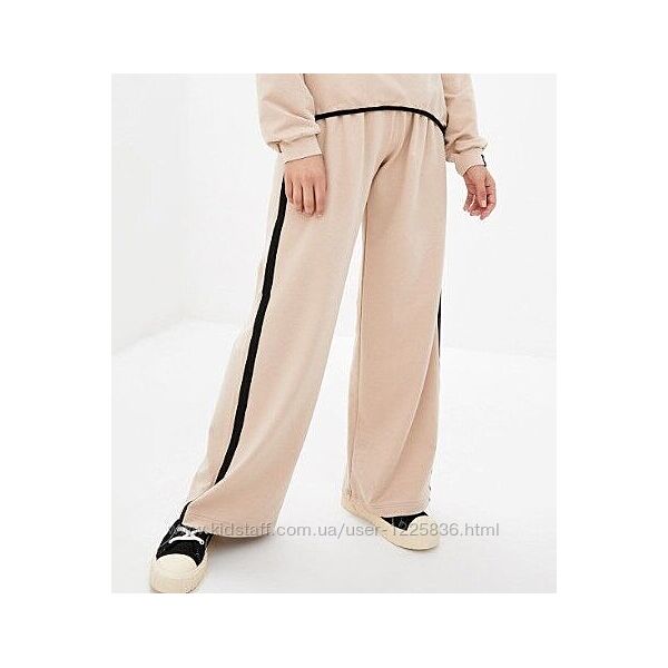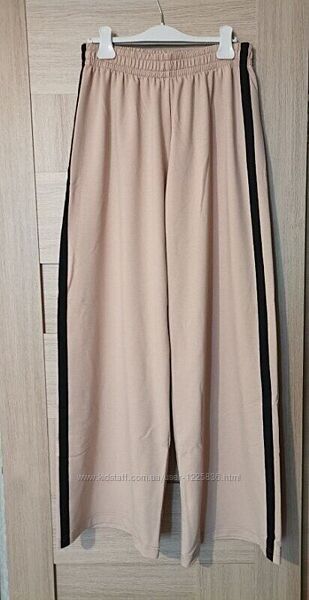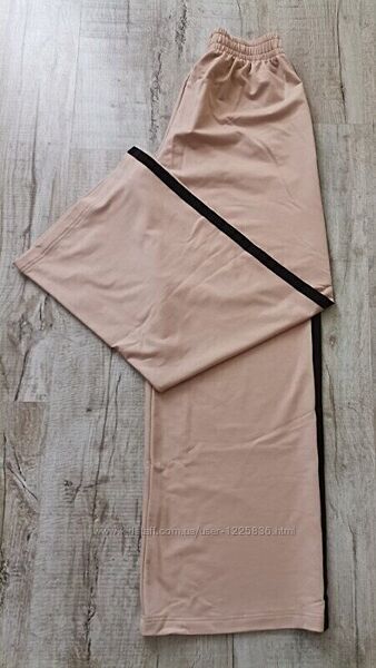 Трикотажные широкие брюки бежевого цвета с лампасами . Актуальная модная сезонная модель . Материал: качественный трикотаж . Состав: 80% хлопок, 20% полиэстер --- Размер L Замеры изделия : - Ширина ПО линии талии 36 см, - Ширина ПО линии бёдер 57 см, - Длина изделия по внутреннему шву 80 см, - Длина изделия по внешнему шву 107 см. --- Доставка : Новая Почта Предоплата 100% Без торга, обмена, возврата.