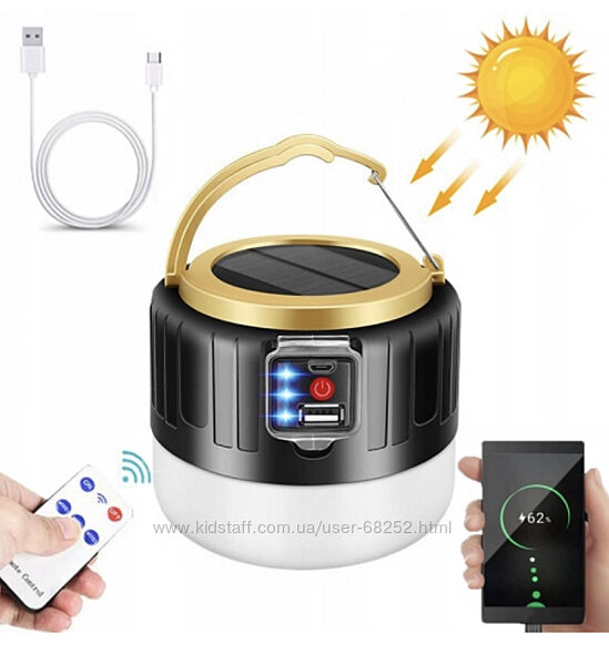 LED Лампа-ліхтар для кемпінгу - це зручний та практичний аксесуар не тільки для заміського відпочинку, а також для користування дома в побуті.Ліхтар має вбудовану батарею-акамулятор, її можна зарядити як від мережі 220, так і від сонячного світла завдяки сонячним панелям, які розташовані на верхній частині виробу.