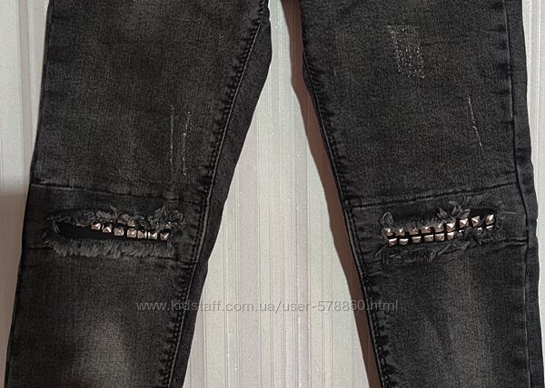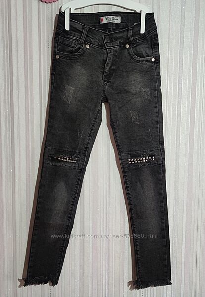 Чорні стильні джинси з клепками на колінах від City Wear для дівчинки у розмірі 7 років.Стан ідеальний. Є утяжка, щільні, тягнуться, вузькі.