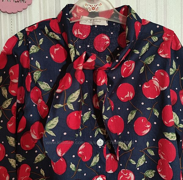 Синя ошатна блуза з вишеньками та зав´язкою на шиї у розмірі 130.Маломірить, орієнтуйтеся на заміри.