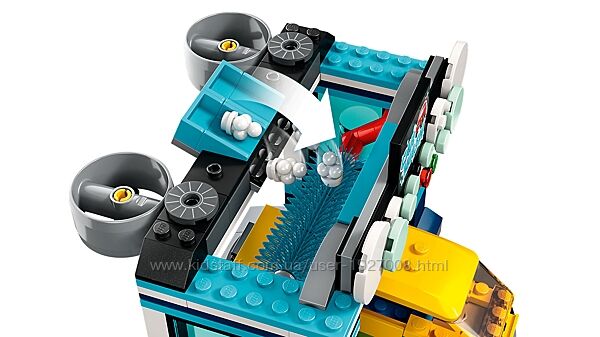 Направляйтесь в городскую автомойку LEGO® City. Проезжайте, чтобы активировать вращающиеся щетки для мойки. Наклоните дозатор, чтобы распылить на машину мыльную пену. Затем поместите вентиляторы, чтобы высушить автомобиль, прежде чем ехать по кругу, чтобы насосом добавить давление в шинах. Мытье автомобиля ни разу не было таким веселым!