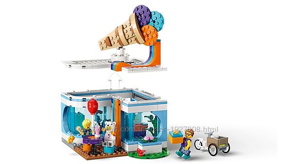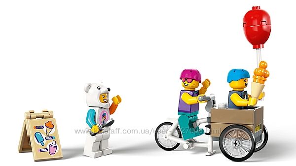 Что внутри? — Все необходимо детям для создания игрушечного магазина мороженого и грузового велосипеда, а также веселые аксессуары и три минифигурки, среди которых продавщица в костюме белого медведя.
