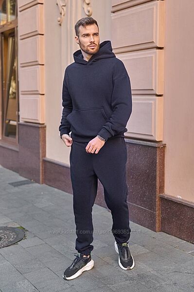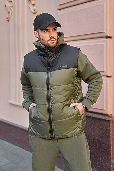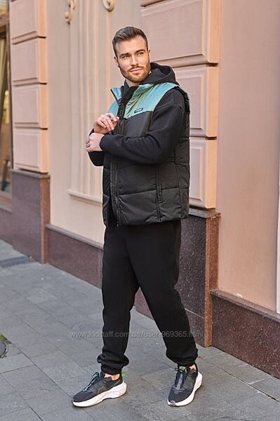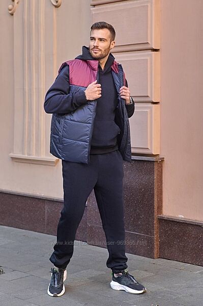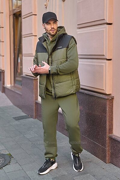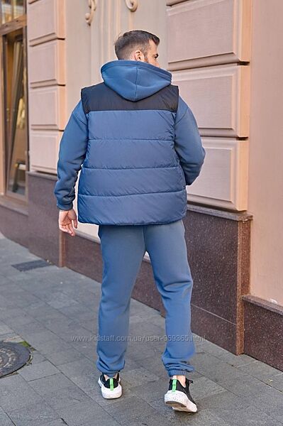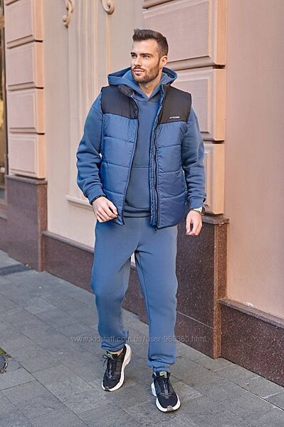 Чоловічий, теплий костюм з жилетом, з кишенею - кенгуру, збоку прикрашений нашивкою, з капюшоном. Рукава на манжетах.