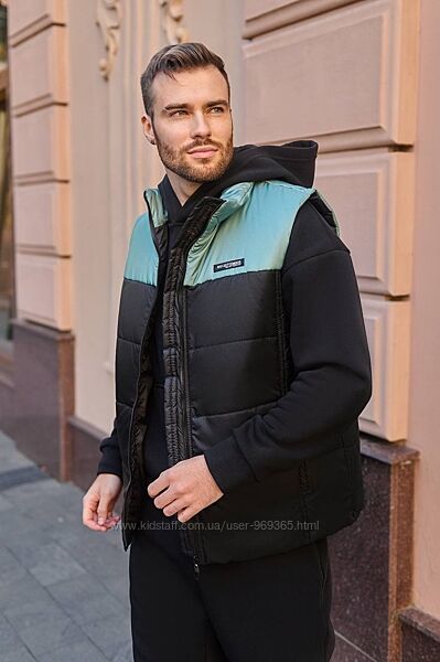 Жилет стьобаний, на синтепоні, на підкладці з плащової тканини, застібається на блискавку, на грудях прикрашений нашивкою: