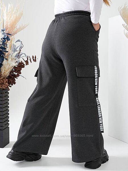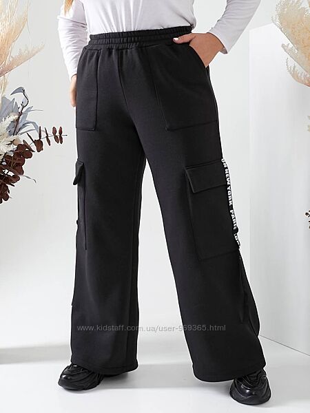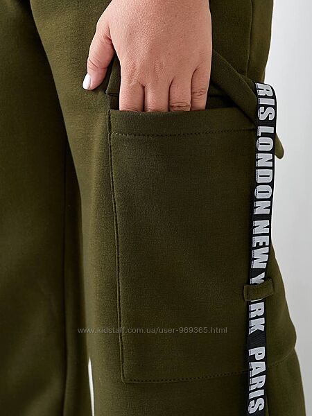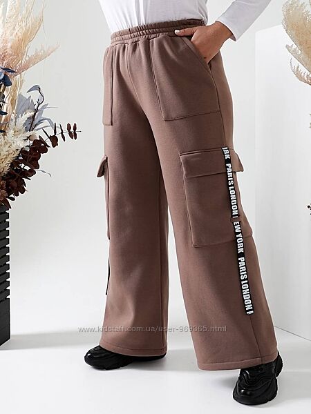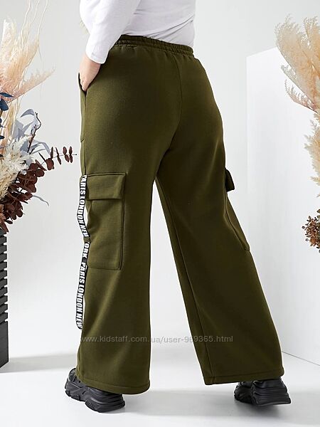 Брюки карго з високою посадкою, з поясом на резинці, теплі. Дуже зручні та комфортні. Доповнені боковими та накладними кишенями з клапанами і прикрашені декоративною стрічкою.