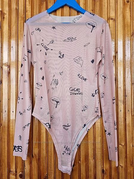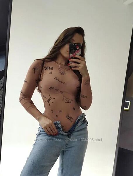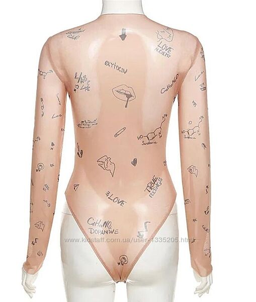 Сітчастий боді комбідрес тату з круглим вирізом декольте та довгими рукавами. Знизу на застібках-кнопках. Горловина та рукава відрізні. В наявності розміри S, M, L. Трохи маломірять. Тканина добре тягнеться. Положення малюнку довільне, може бути перевернутим. Розмір S: ПОГ 37 см, ПОТ 28,5 см, ПОС 33 см. Довжина 67 см, Рукав 59 см Розмір М: ПОГ 39 см, ПОТ 31 см, ПОС 35 см. Довжина 70 см, Рукав 60,5 см
