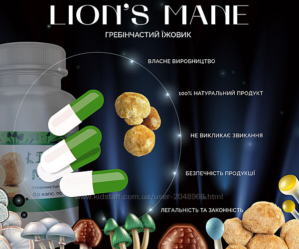 Склад: 70% міцелій їжовика та 30% плодове тіло їжовика, капсули.
