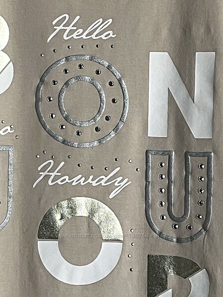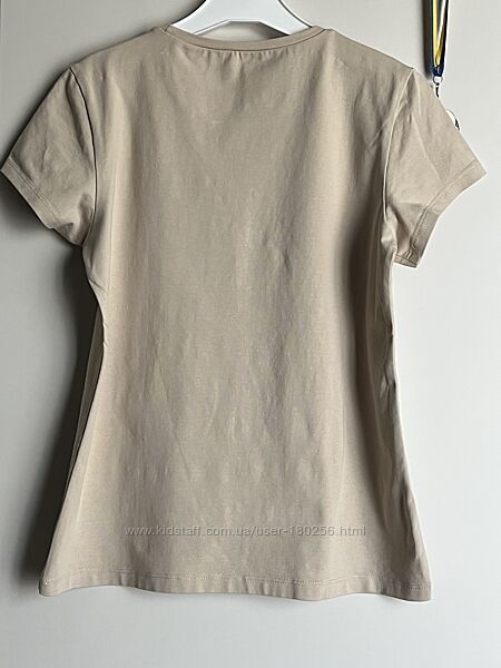 Футболка ТМ Mayoral (Іспанія)бежевого (нюдового) кольору прикрашена аплікаціями літер та металевими стразами. Тканина - бавовна + еластан. Стан - відміний.Розмір 16 (до 162 см)