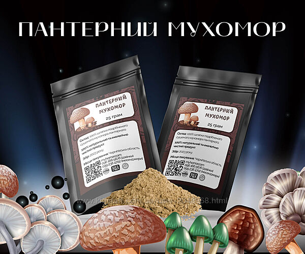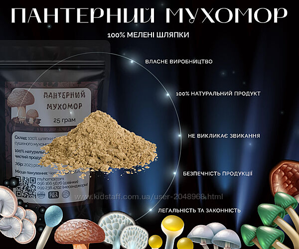 Упаковка містить 25 г.Склад: 100 % мелені шляпки пантерного мухомора, без домішок.