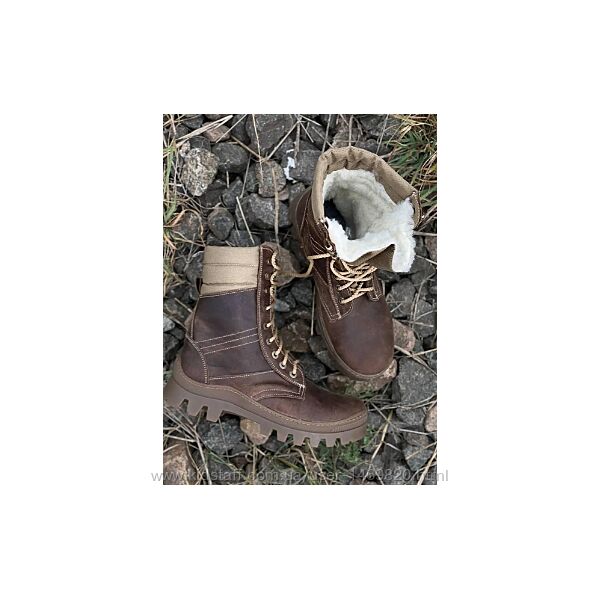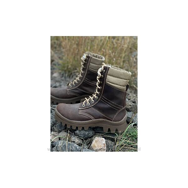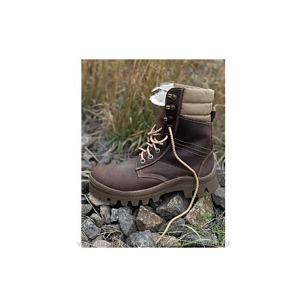 Берці берци зимові коричневі шкіряні.Поверхня взуття виготовлена з високоякісної турецької гладкої шкіри і вставок з кордури (має вологостійкі властивості); -шви виготовлені надійним способом, проходять гідрофобну обробку; шнурки з міцного нейлона (не протираються), чітко фіксують ногу і не тиснуть а неї при ходьбі. Внутрішня частина взуття виготовлена з євро-вовни( 50% натуральна вовна,50% якісна синтетика), температурний режим до -15. Підошва зносостійка.