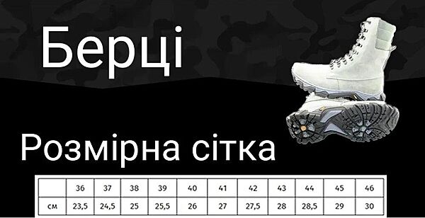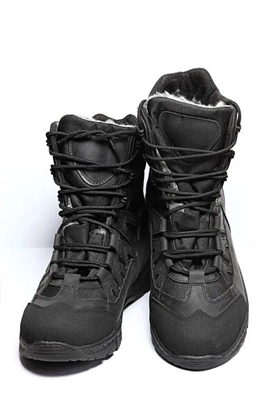 Берці берци зима чорні на хутрі з посиленим носком і пятою.Розмірний ряд 40-46. Поверхня взуття виготовлена з високоякісної міцної шкіри crazy horse і вставок кордури (має вологостійкі властивості) -шви виготовлені надійним способом, проходять гідрофобну обробку; шнурки з міцного нейлона (не протираються), чітко фіксують ногу і не тиснуть а неї при ходьбі. Внутрішня частина взуття виготовлена з вовни, температурний режим до -20. Зносостійка ТЕП підошва.