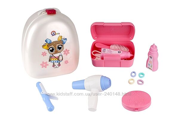 Комплектація: рюкзак, косметичка, плойка, фен, гребінець, щітка, дзеркало, ножиці, заколка гребінець, пудрениця, 4 резинки для волосся, 2 баночки з "кремом" і "шампунем", пінцет.
