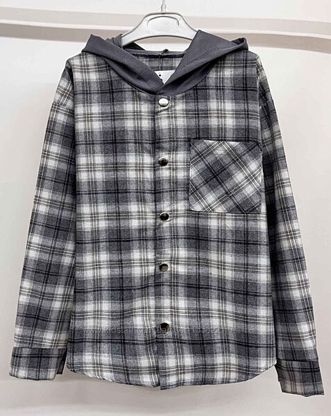 Рубашка підліткова для хлопчика і дівчинки, попереду застібка кнопки, довгий рукав під манжет, попереду нашита кишеня, низ фігурний, є капюшон, підійде для дітей від 9-10 років до 12-13 років.