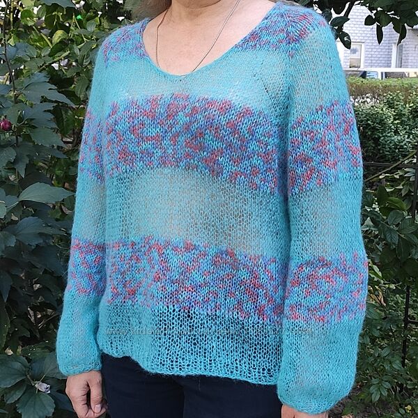 Полюбляю міксувати різні текстури ниточок, а також кольори. В цьому тандемі поєднала секційну альпаку 100% від Filcom art.Letizia та суперкідмохер Morgan. Вага светрика всього 105 грамів!