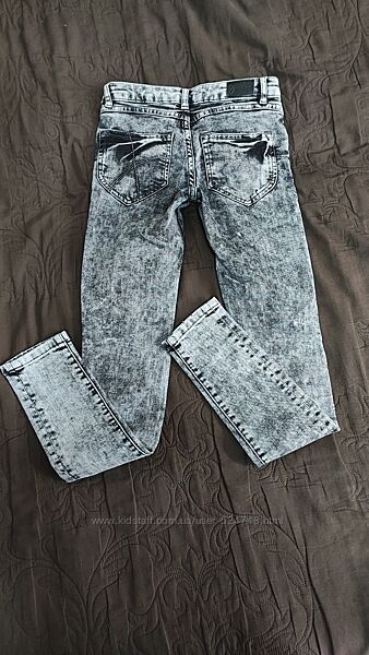 Сіро-чорні джинси на дівчинку, стан відмінний, склад- 98%котон, 2%еластан. Трохи тягнуться.Заміри: довжина-85см, ширина штанини-13см, ПОБ-35см, ПОТ-30см, є утяжка.