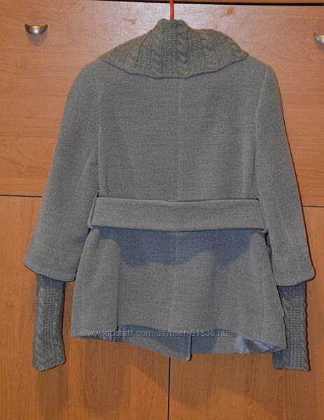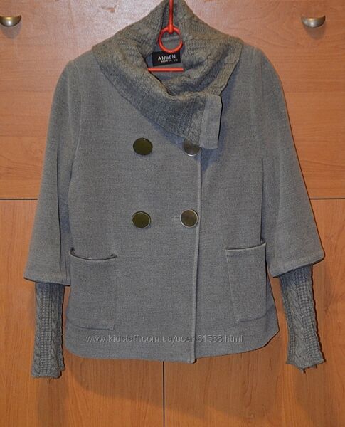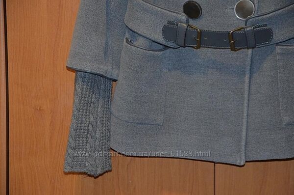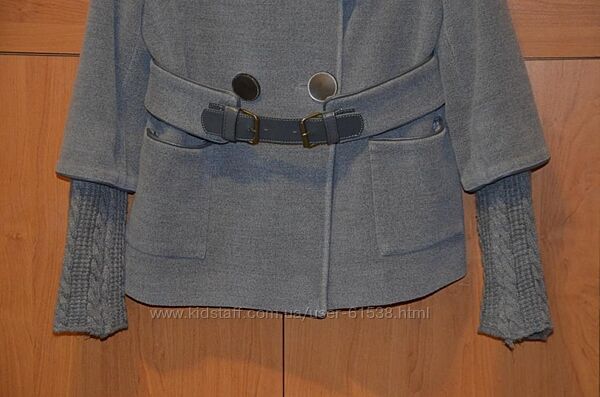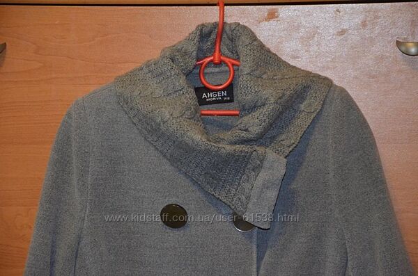 Демісезонне пальто для дівчинки Ahsen Morva.Двобортне, застібається на гудзики. Попереду є накладні кишені. Рукав 3/4 з високим в´язаним манжетом, який можна повертати. Комір такої ж в´язки, що й манжети. Талію підкреслює пояс.