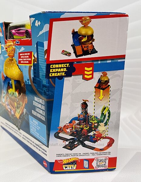Підключіть Hot Wheels City Downtown Burger Drive-Thru до інших наборів Hot Wheels, щоб побудувати унікальний світ веселощів і пригод із чудовими функціями, які покращують гру та приносять задоволення!